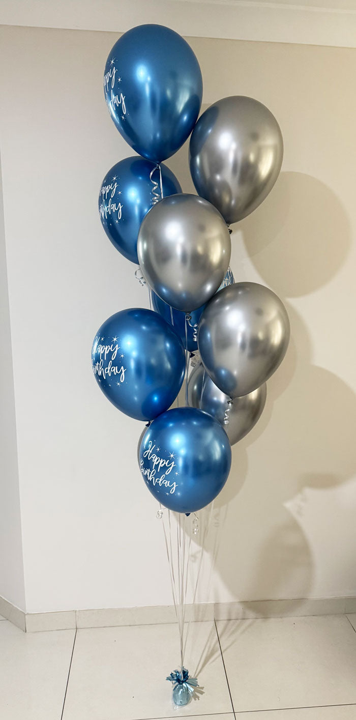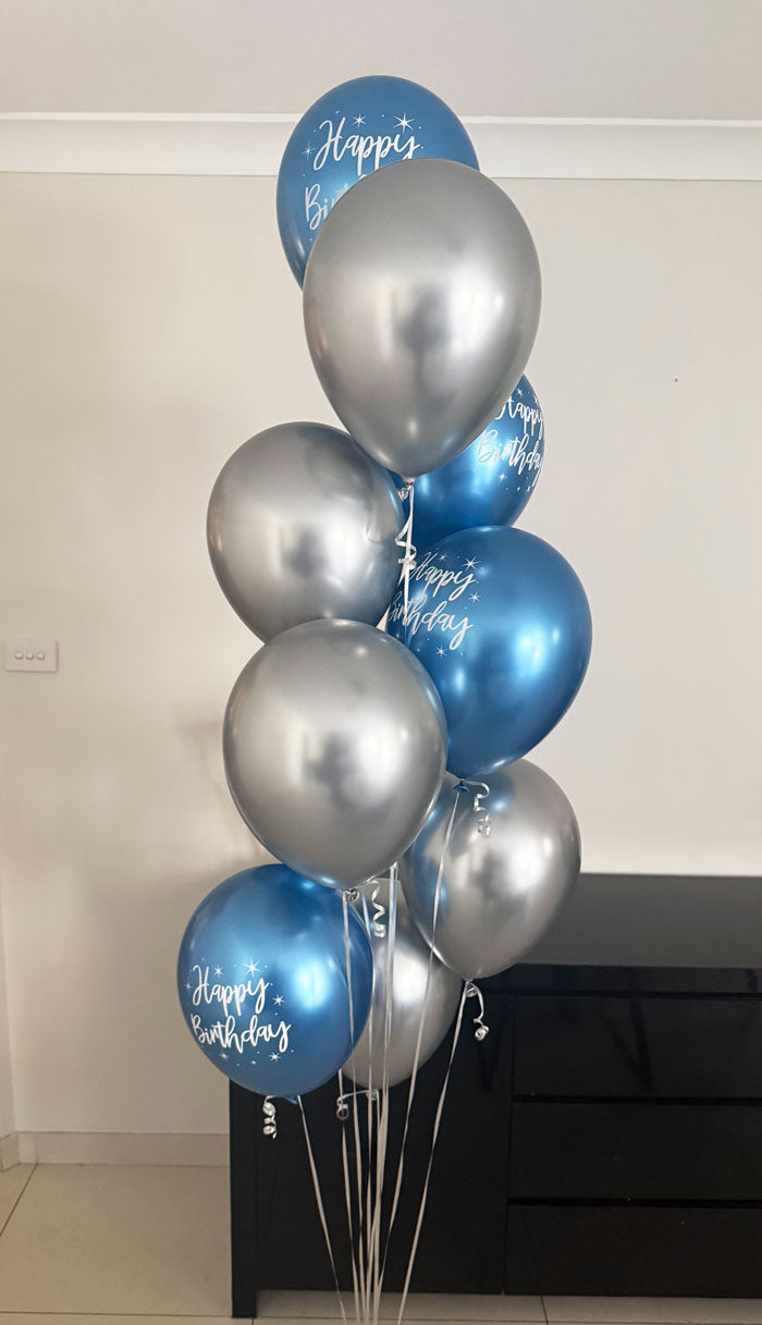 Enjoy your birthday party with Blue and Silver chrome latex balloon bouquet.