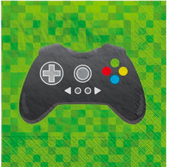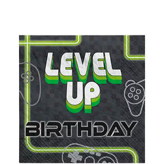 Level Up Gaming Beverage Plates pack of 8, which measures 7 inch x 7 inch and have printed Game On in the middle of them surrounded by controllers. Check Level Up Gaming party supplies category for matching tableware.